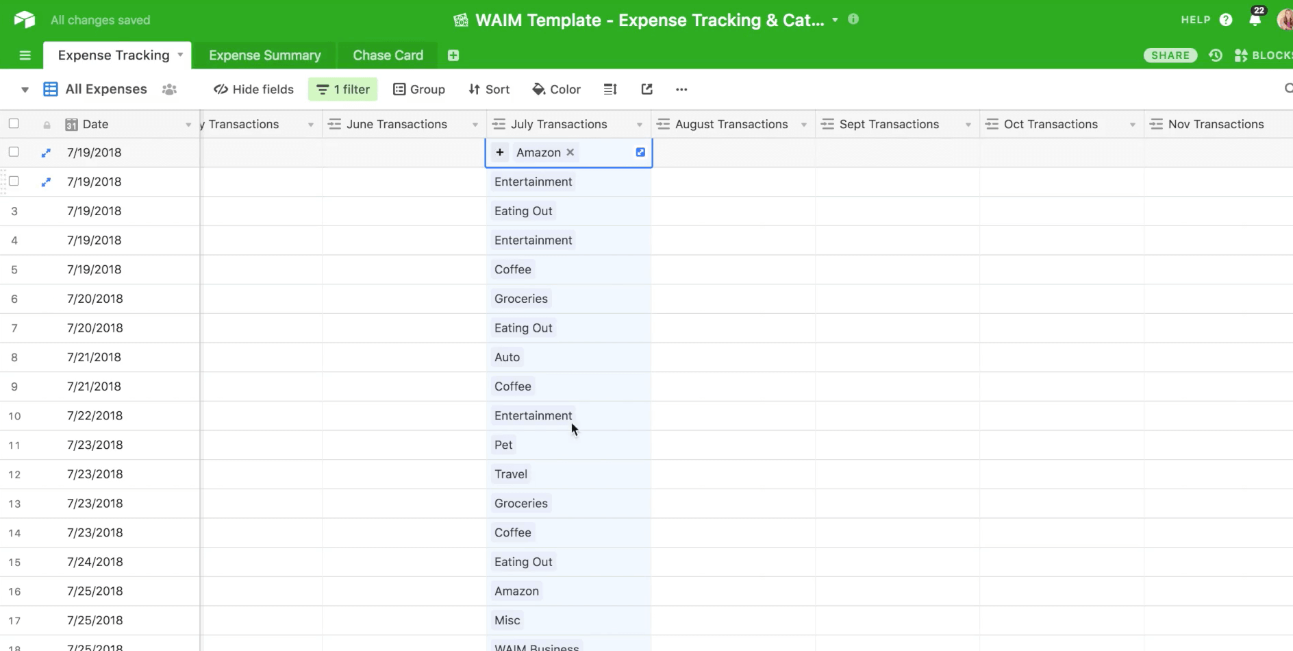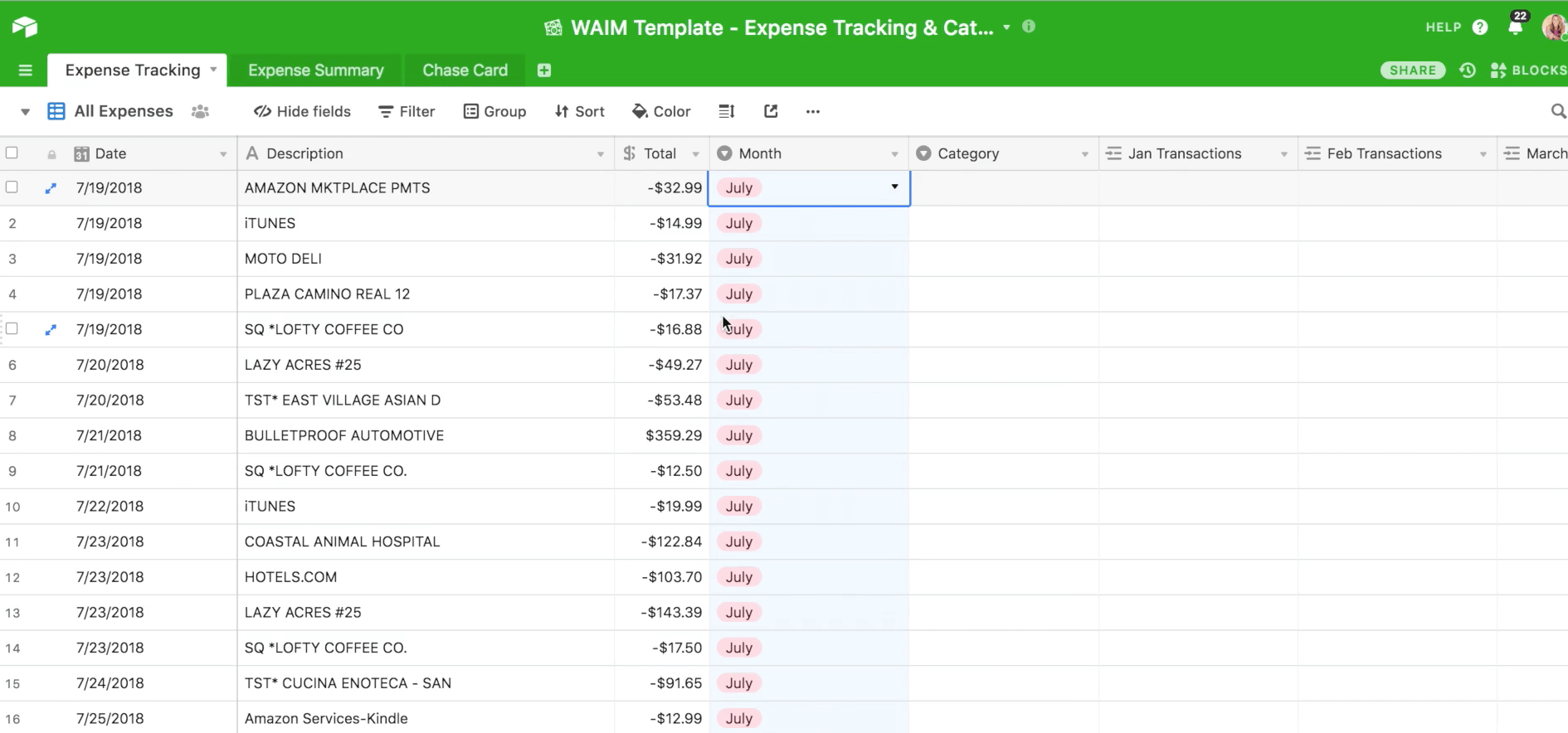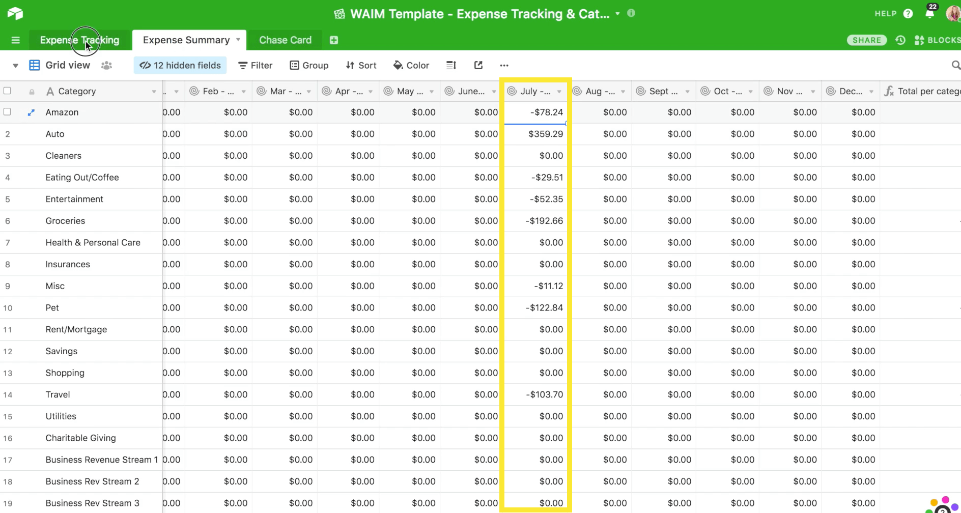 These log columns are linked to the Monthly Summary tab, so by doing this step, you’re effectively telling Airtable to attribute that amount for that particular client under that particular month. Once you paste the client name under the appropriate log, the amount pops up in the Monthly Summary tab. Watch it in action: