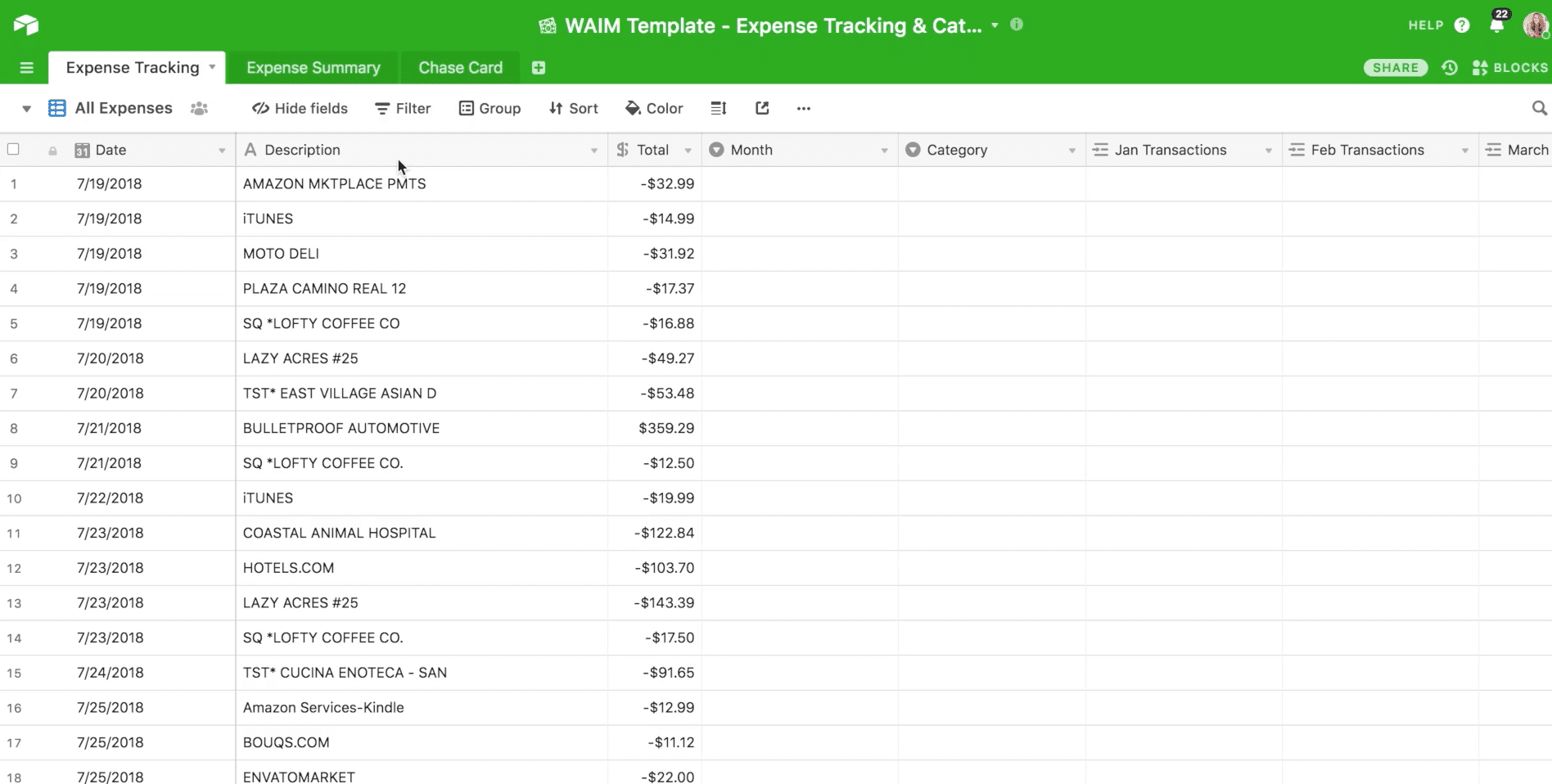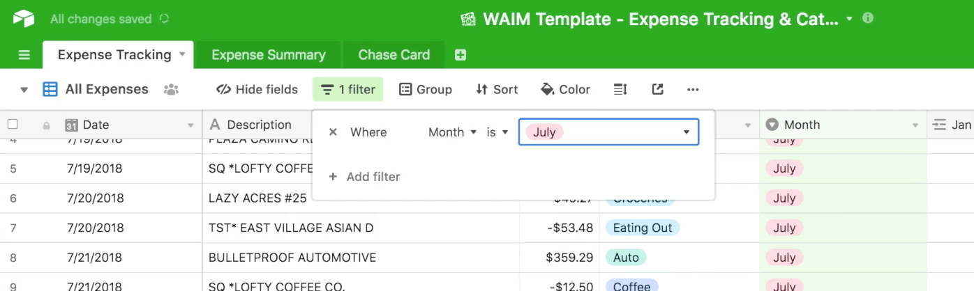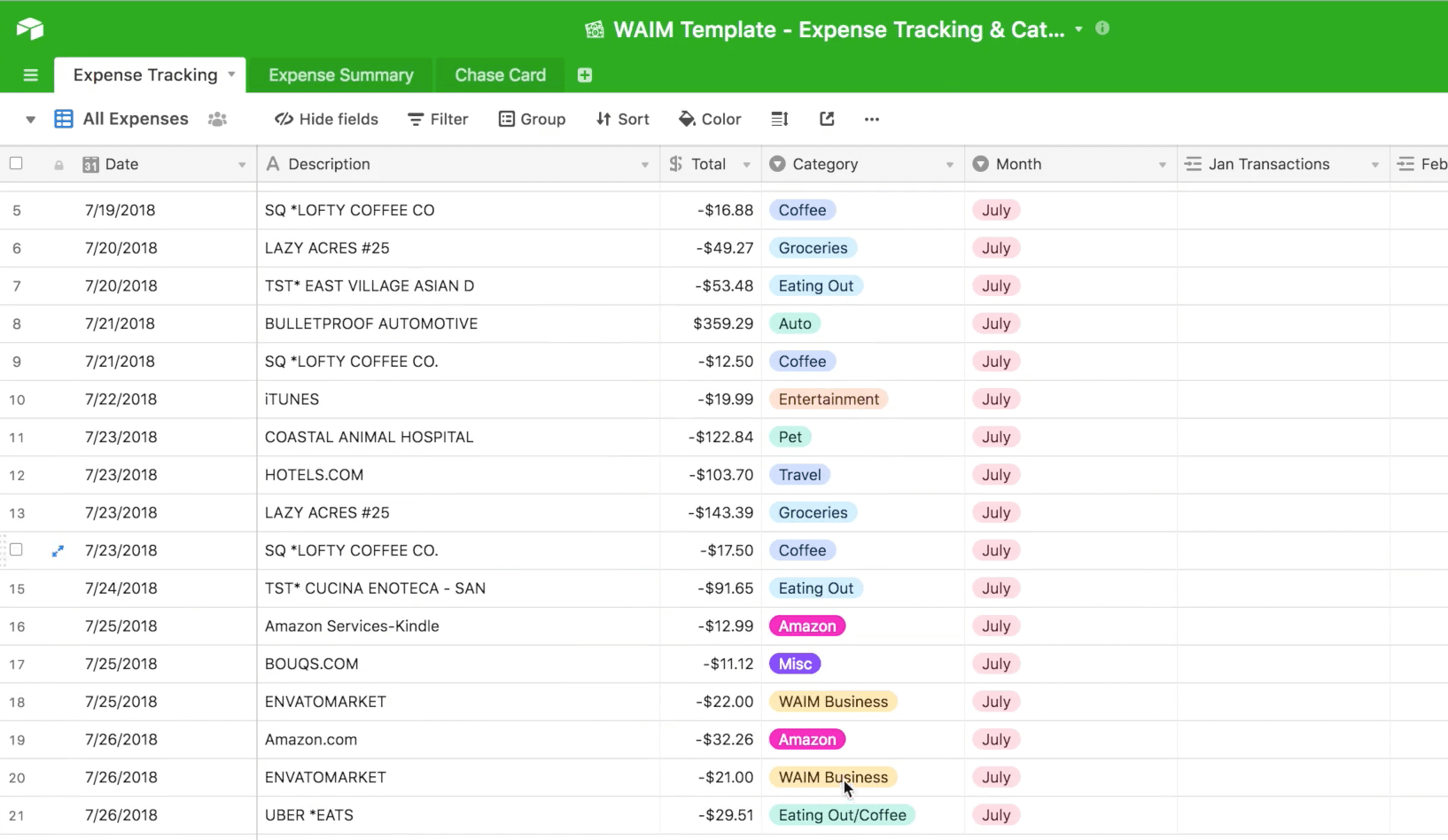 These log columns are linked to the Monthly Summary tab, so by doing this step, you’re effectively telling Airtable to attribute that amount for that particular client under that particular month. Once you paste the client name under the appropriate log, the amount pops up in the Monthly Summary tab. Watch it in action: