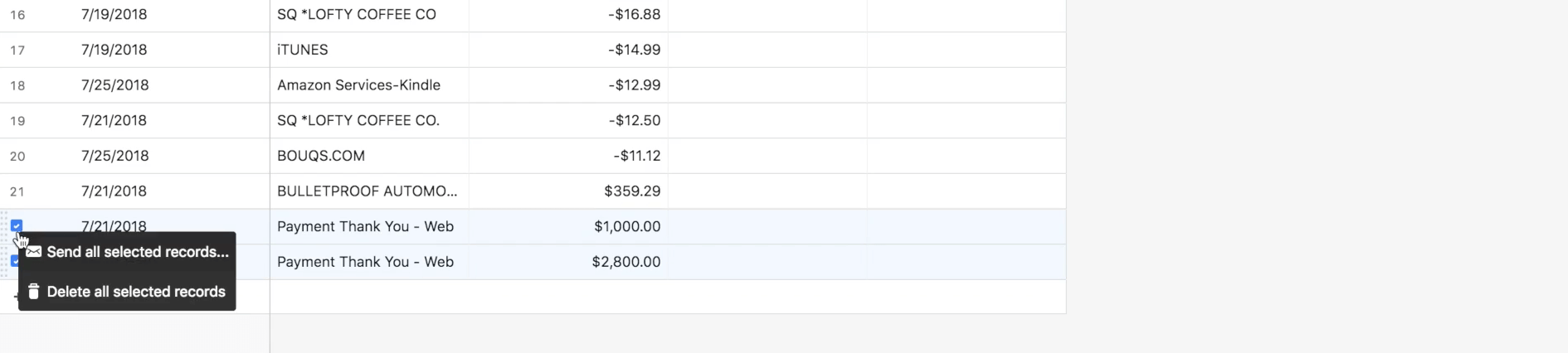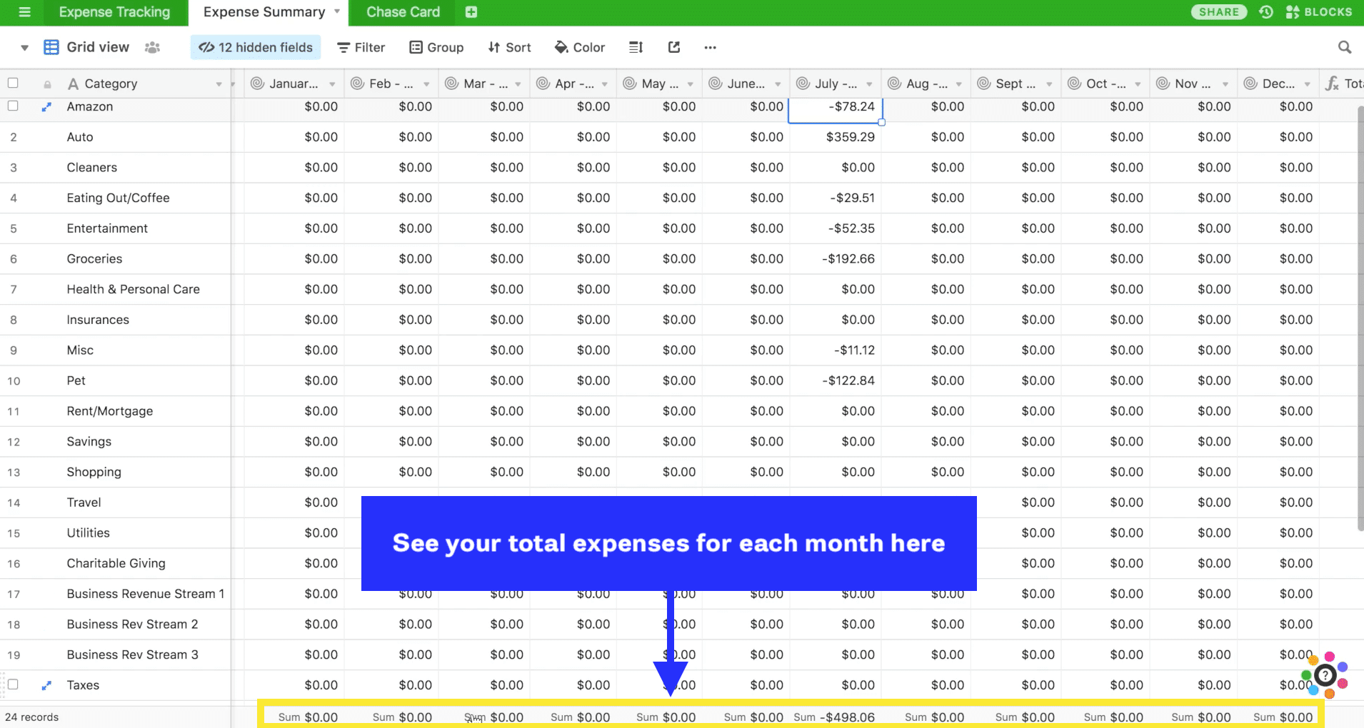 Now here’s the cool part. The way we have the Airtable setup, there’s also a “Monthly Summary” tab which aggregates all the revenue for a given month. However, we need to tell that summary tab which records (rows) to add up under each month. The next step is how we do that!