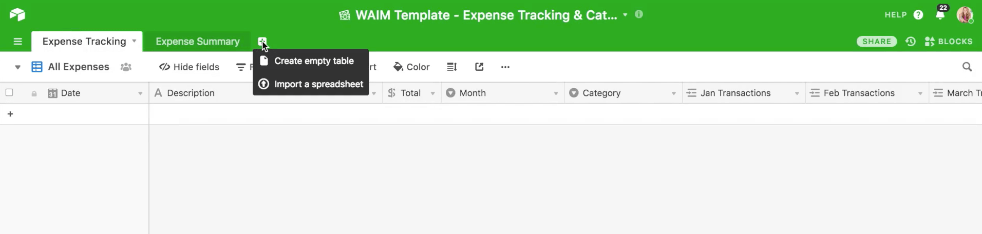 Step 6: Import the raw data from your CSV into a new tab on your Airtable. Click the + button and select “Import a spreadsheet.”