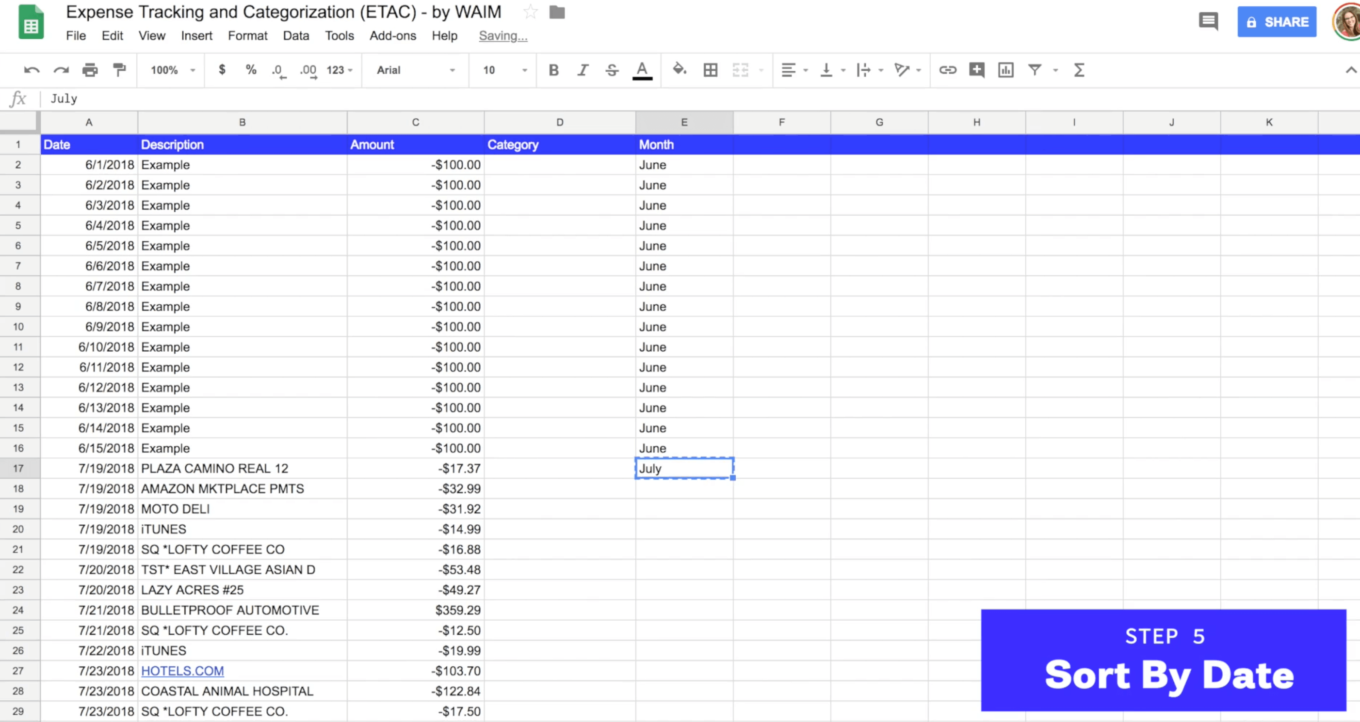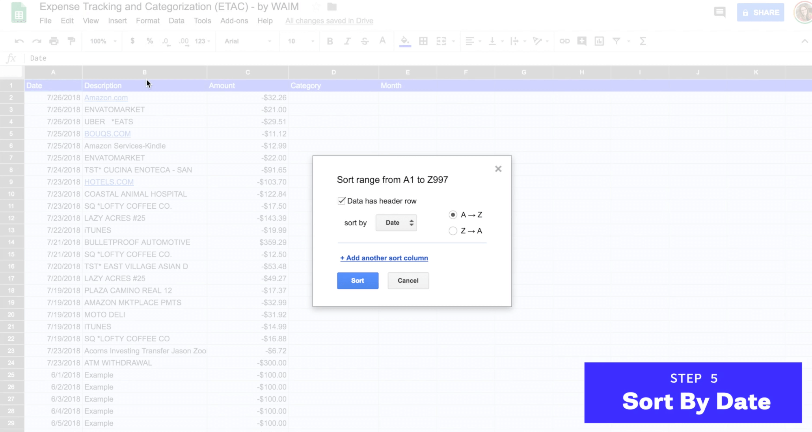 If your primary column is not your transaction date (mine is actually my Description in the example below), you’ll first want to copy that column, add a new column, and then paste that data like I did here. Then you’ll copy your date data and paste that over the primary column. Finally, just drag and drop the amount column so you’re left with the correct order Date, Description, Amount. If that was confusing, see it in action here: