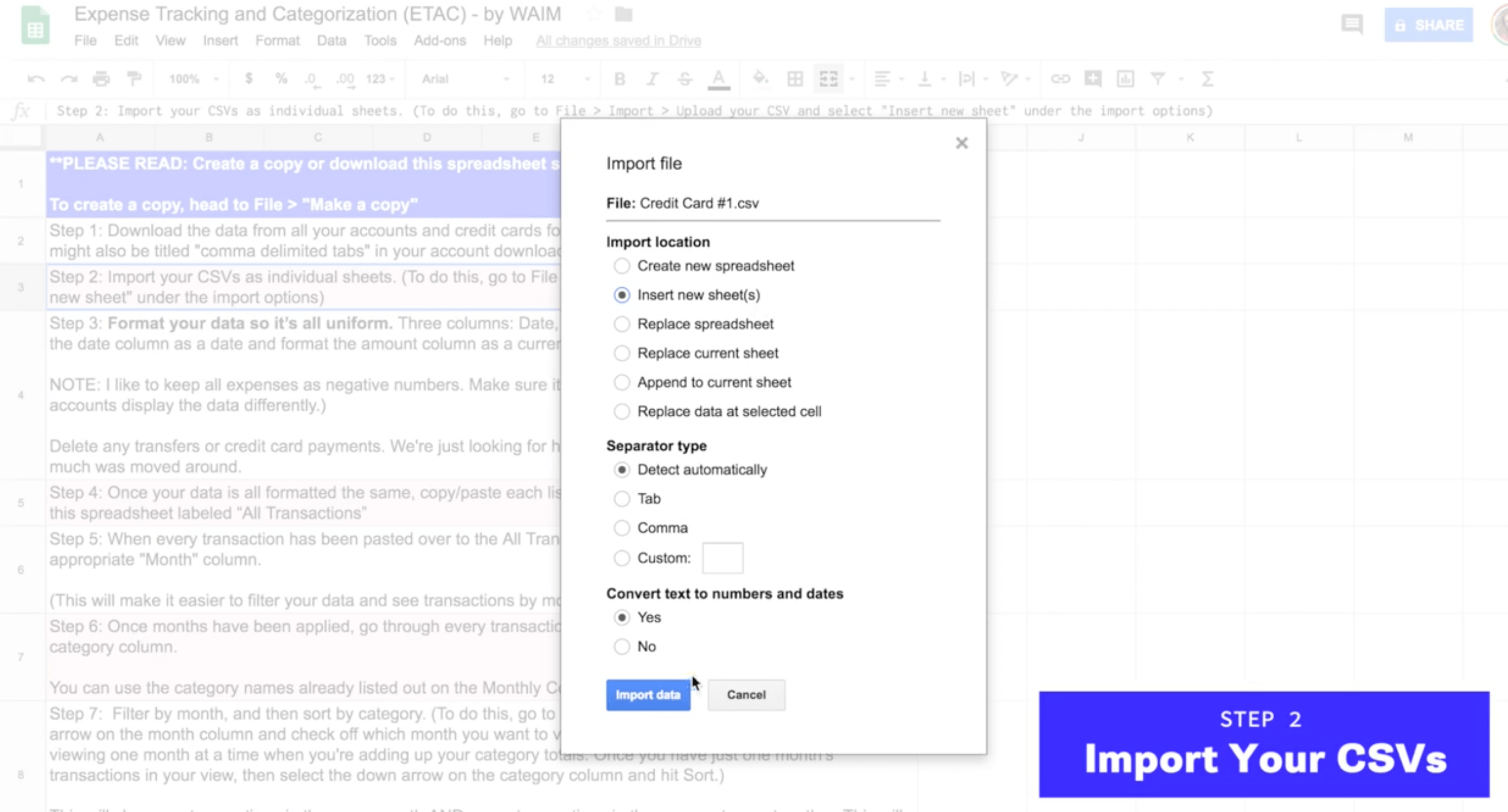 Step 3: Import your CSV into your Sales Dashboard spreadsheet as a new tab/sheet by going to File > Import… You can import as a new tab or you can replace the “January 2018” tab in the template.
