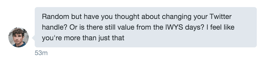 A few people began asking me about my @iwearyourshirt username and if I had thought about changing it. I gave them the honest answer: I hadn’t changed it because I’d lose my verified status, and I felt like that was some small advantage I had as a completely online-based business owner. Reading that back now, I can see how silly it sounds. But it’s amazing the lies we’ll tell ourselves to avoid difficult decisions.