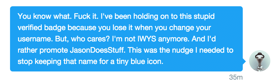 I hit the delete key a bunch of times. I typed in “jasondoesstuff” as my new username. And I clicked the save button on my Twitter settings. My new and more appropriate identity now replaced the one that gave me my entrepreneurial start. And my blue verification symbol was gone.